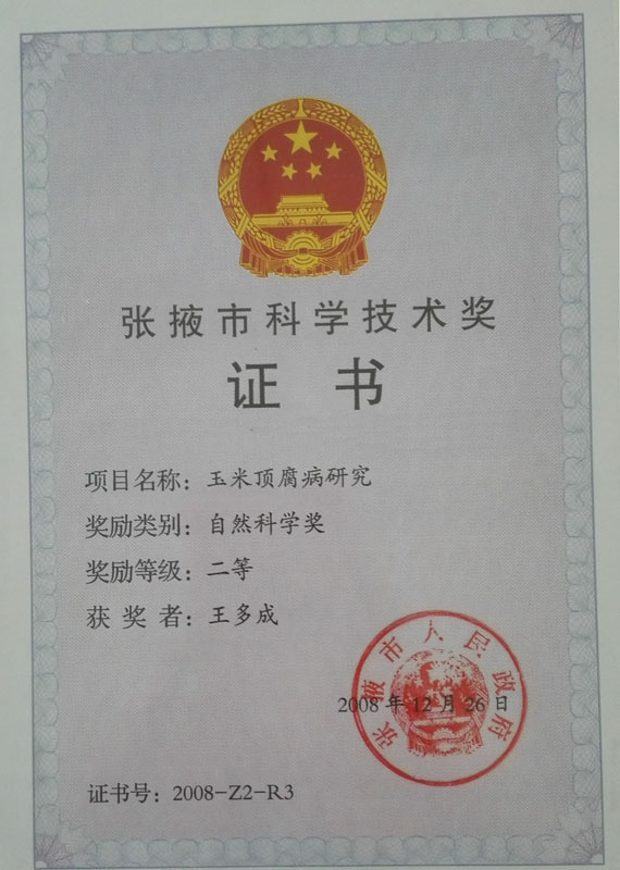 | 2008年榮獲張掖市科學(xué)技術(shù)二等獎(jiǎng)證書 | ||