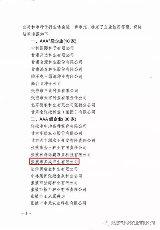 熱烈祝賀張掖市多成農(nóng)業(yè)有限公司被評為2017年度信用等級AAA級企業(yè)!! 2017年2月24日,張掖市農(nóng)業(yè)局、張掖市種子行業(yè)協(xié)會公布的《2016年度玉米種子企業(yè)信用等級評估結(jié)果》中,張掖市多成農(nóng)業(yè)有限公司被評為2016年度信用等級AAA級企業(yè)。 |